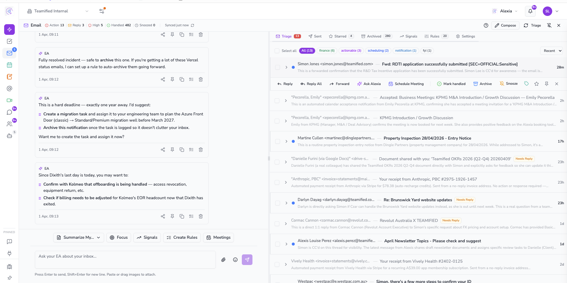 Your EA categorizes every email by type - finance, actionable, scheduling, notifications - so you see what matters first. The actions toolbar lets you reply, forward, archive, schedule meetings, or ask Alexia to handle it, all from one place.