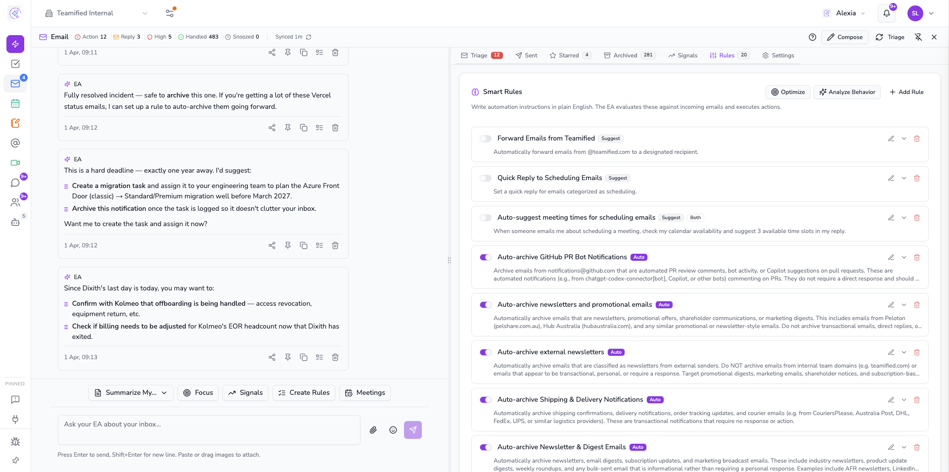 Create automation rules in plain English and your EA evaluates them against every incoming email. Auto-archive newsletters, auto-suggest meeting times, forward important emails - all running automatically without you lifting a finger.