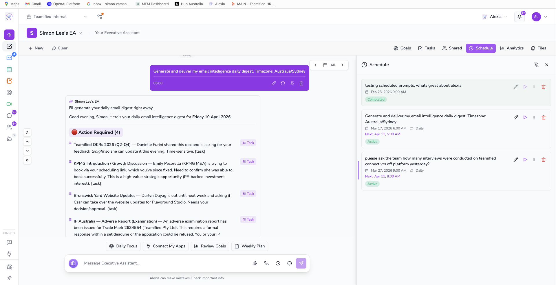 Configure your EA to run recurring prompts on your schedule. Daily email digests at 6am, team check-ins every morning, weekly data pulls - all running automatically. Each scheduled prompt shows its status, next run time, and frequency.