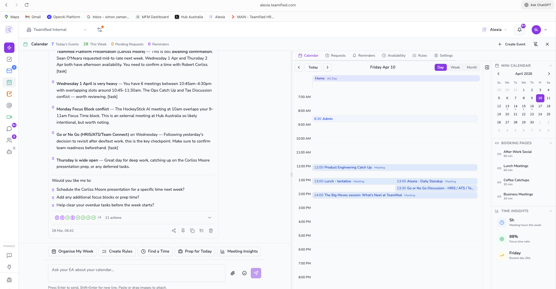 Your EA manages your calendar with a full weekly view, booking pages for different meeting types, and time insights that show how you're spending your hours. It detects scheduling conflicts, suggests prep time, and keeps your focus blocks protected.